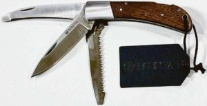 錆や腐食に対する高い体制を兼ね備えた440Cステンレススチール製。メインブレードのほか腸裂きナイフとノコギリがついた折り畳み式ナイフ。